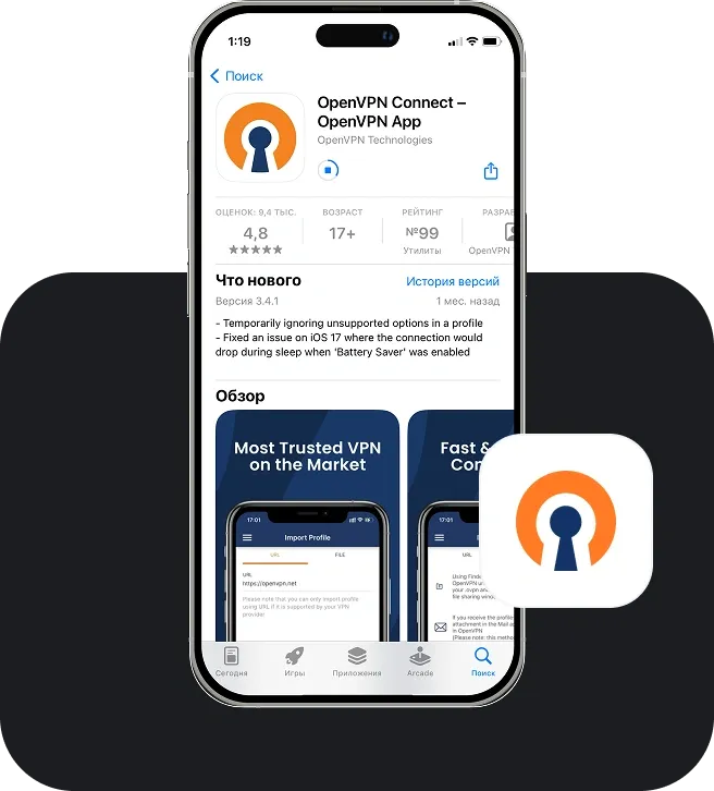 Загрузите приложение OpenVPN, чтобы подключиться к VPN, добавив ключ конфигурации.